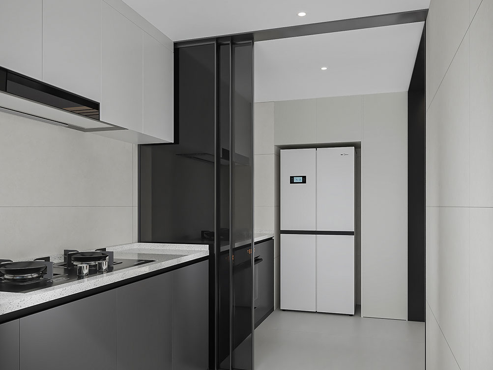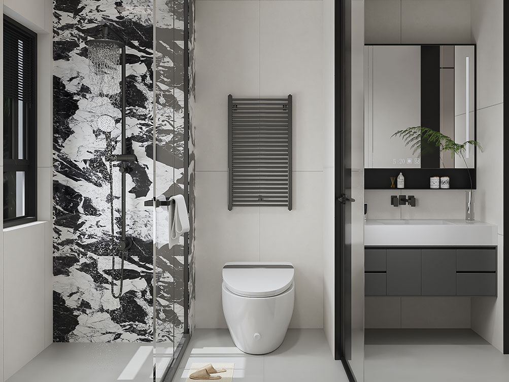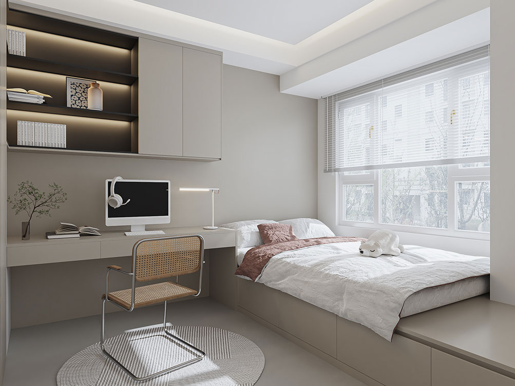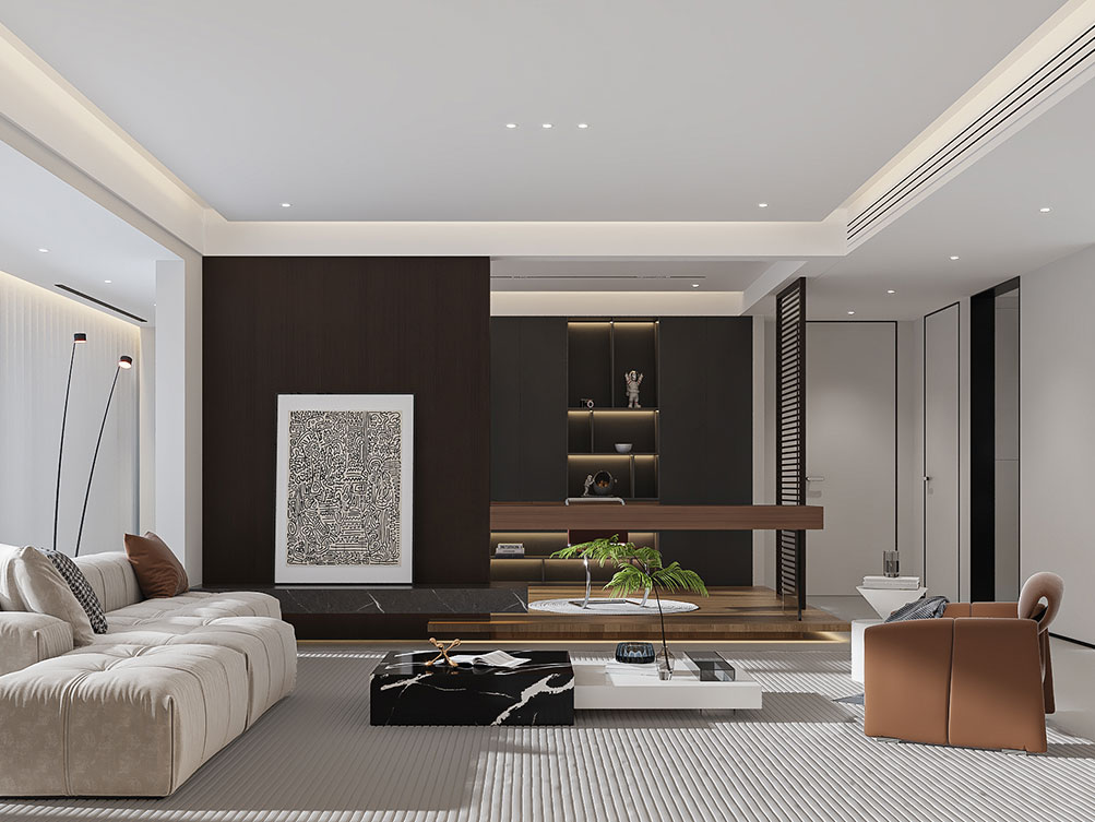 济南阿达森装饰为颖秀华府打造的现代极简轻奢风。浅米色大尺寸沙发柔化空间,搭配焦糖棕单人椅,用撞色拉出层次感;黑白纹理茶几与同质感背景墙呼应,高级又利落。深色木饰面 + 内嵌灯光的柜体,既做收纳又成视觉焦点,悬浮式地台延伸出松弛的休闲区,墙面艺术画则添了艺术张力。整体以低饱和色调铺底,通过材质对比平衡精致与舒适,刚好契合颖秀华府高端社区的品质调性,把都市大宅的松弛感稳稳拿捏。