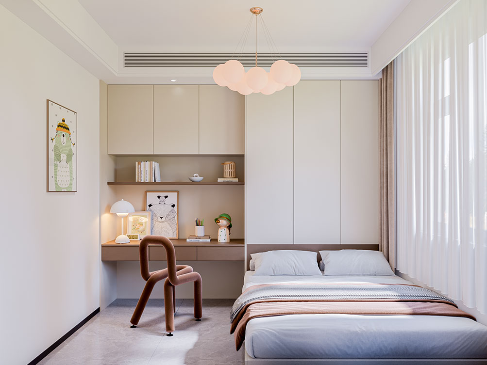 济南阿达森装饰为万象东方设计的现代简约风装修,以浅米色系打底,整面定制柜藏起杂乱的隐形收纳巧思,正契合济南写字楼办公室装修里的高效空间利用逻辑;悬浮式电视柜的轻盈感,弱化了厚重感;环形吊灯勾勒柔和氛围、通透纱帘引自然光漫入的设计,和济南小型办公室装修里借光扩空间的思路异曲同工,整体既适配万象东方的通透户型,又用低饱和色调软萌软装,把都市居所的舒适与松弛精准落地,日常感与精致感刚好平衡。