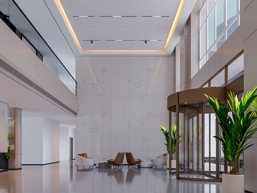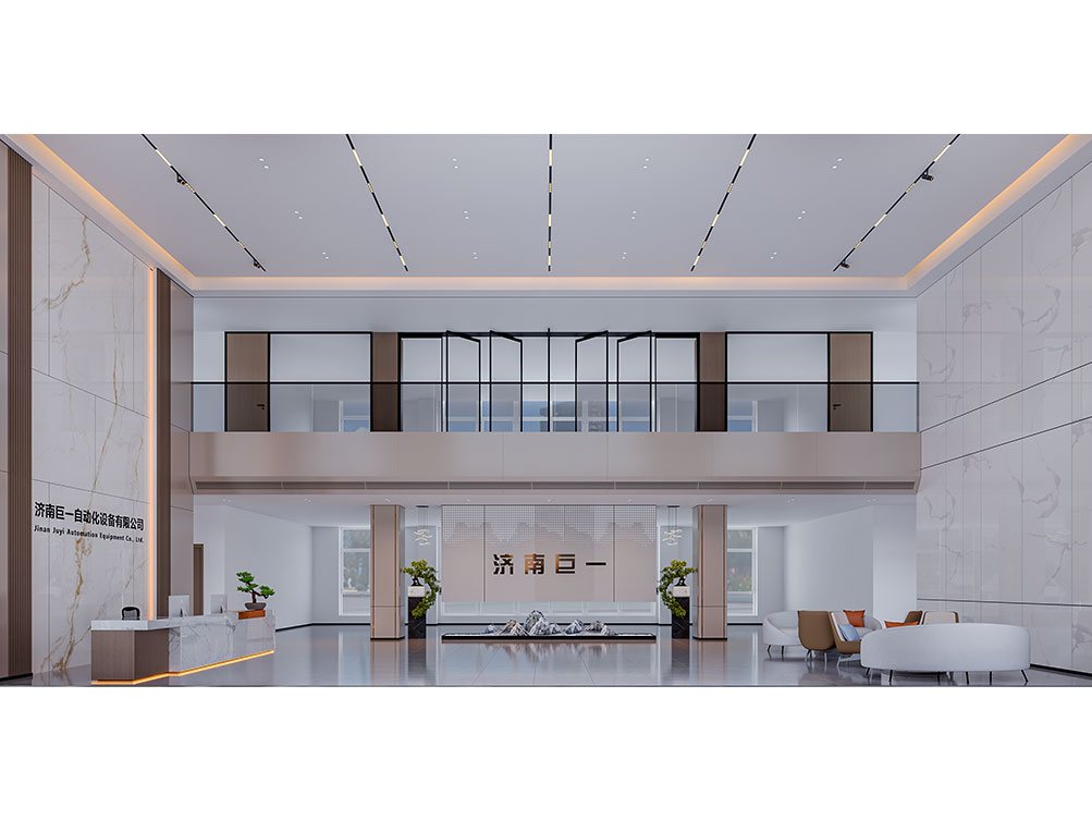 设计理念: 作为济南办公室装修中企业形象型空间的代表,巨一自动化大堂以大理石饰面 + 金属线条打造轻奢质感:挑高空间搭配嵌入式灯光,强化大气氛围;弧形旋转门与绿植点缀柔化冷硬,前台与品牌墙的一体化设计精准传递企业形象,契合济南办公室装修商务展示接待功能的核心需求,是济南工业企业办公空间的高端范本。