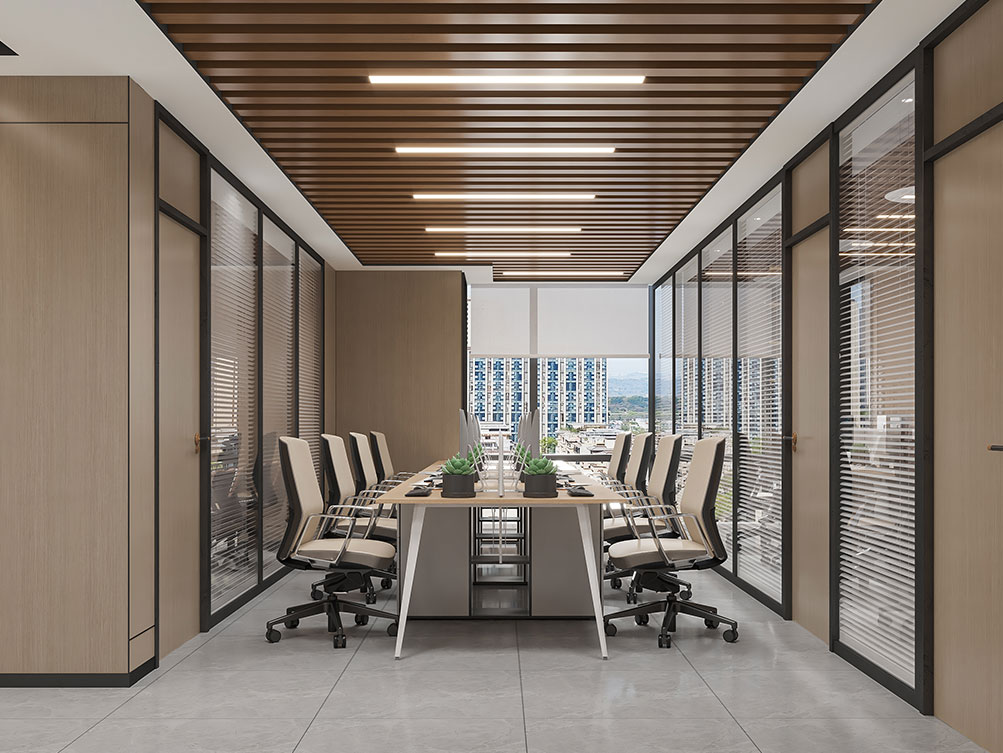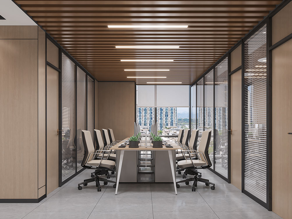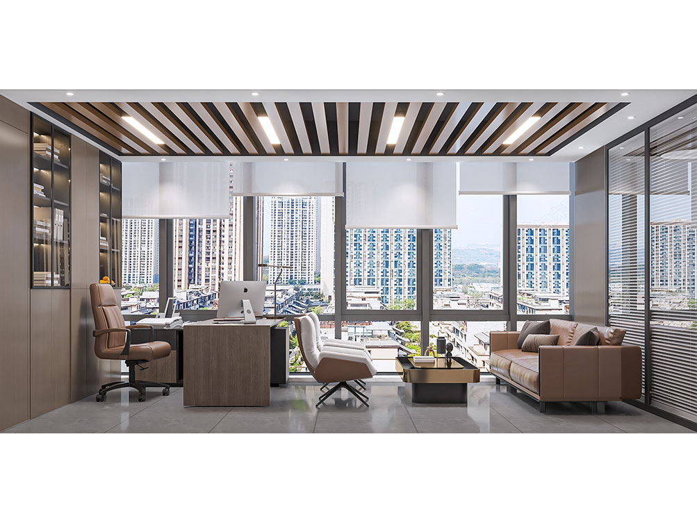 本次装修工程以高端大气来装修济南厂房办公室项目,以现代简约赋能高效办公为核心,完成了从传统生产型厂房到现代化高端办公空间的焕新升级。我们在办公室装修设计中深度结合企业的高端大气需求,打造出兼具专业质感与人文温度的办公场景。总经理办公室采用木饰面与金属线条的精致搭配,整面落地窗引入城市景观,浅棕皮质家具与简洁动线既彰显办公空间的高端沉稳,又能商务洽谈与日常办公都能在开阔视野中高效推进;会议室以竖条木质吊顶增强空间纵深感,玻璃隔断在保障隔音效果的同时保留视觉通透;开放办公区则打破传统厂房的封闭感,通过模块化工位布局与充足的自然采光,激发团队协作活力。整个厂房办公室装修项目不仅实现了空间功能的优化升级,更以细节处的人文关怀,为企业注入持久的发展动能,成为济南厂房装修领域兼具实用性与美学价值的标杆案例。