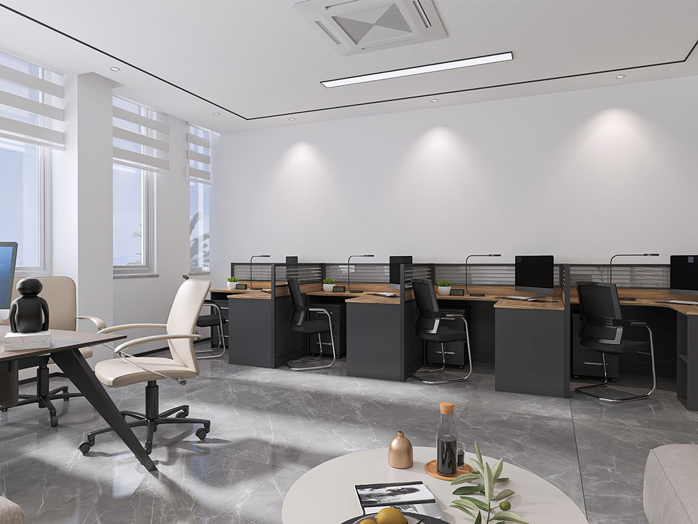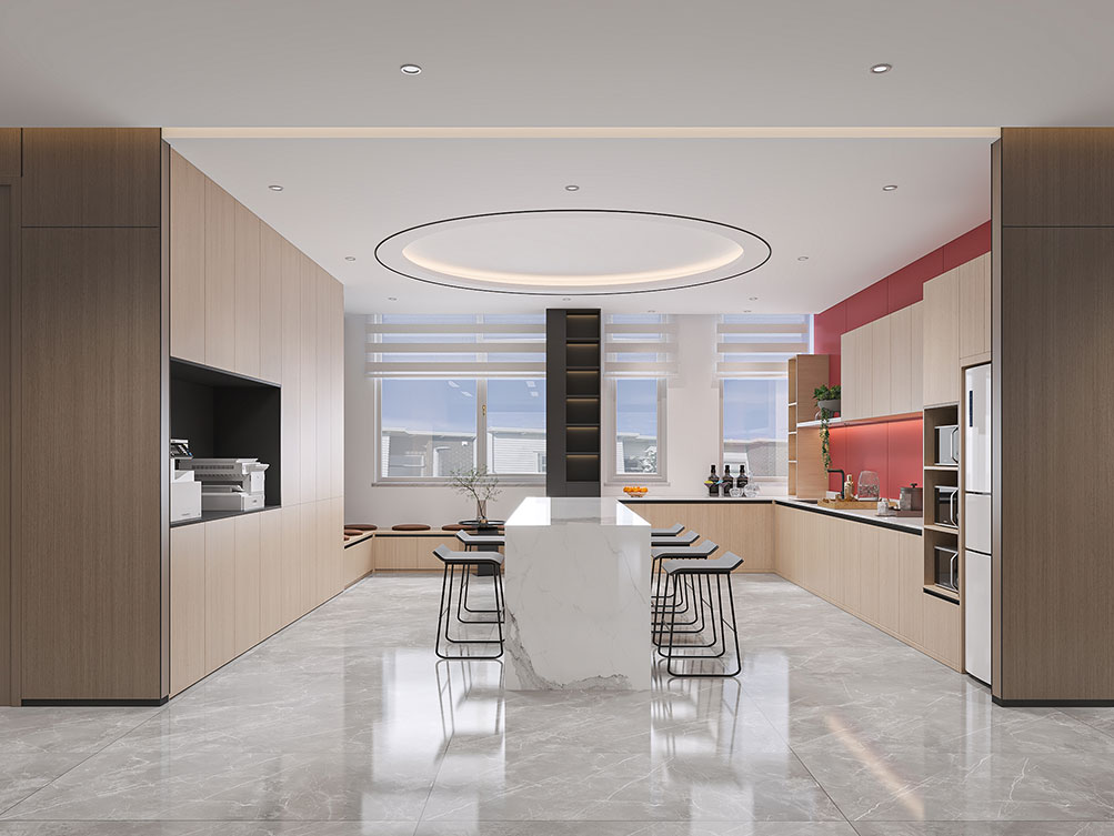 维康国际装修效果以 “科技感 + 现代简约” 为核心,主色调选用浅灰、白色搭配科技蓝点缀,契合企业国际化、前沿化的定位。前台接待区采用哑光金属与玻璃拼接的背景墙,嵌入发光的 “维康国际” LOGO,搭配悬浮式接待台与简约艺术装置,营造轻盈前卫的第一印象;开放办公区采用模块化智能工位,配备可调节灯光与充电接口,桌面预留无线投屏设备,满足高效协作需求,墙面穿插企业全球业务版图挂画与绿植,平衡科技感与自然气息;独立办公室以木饰面与玻璃隔断结合,保障私密性的同时提升空间通透感,书柜陈列行业典籍与企业荣誉;洽谈区选用质感布艺沙发与圆形茶几,搭配暖光吊灯,为商务沟通营造舒适氛围,同时在走廊、休闲区融入科技元素装饰(如流线型灯带、数字艺术屏),强化品牌调性,整体空间兼具国际化形象与实用办公功能,贴合企业发展需求。