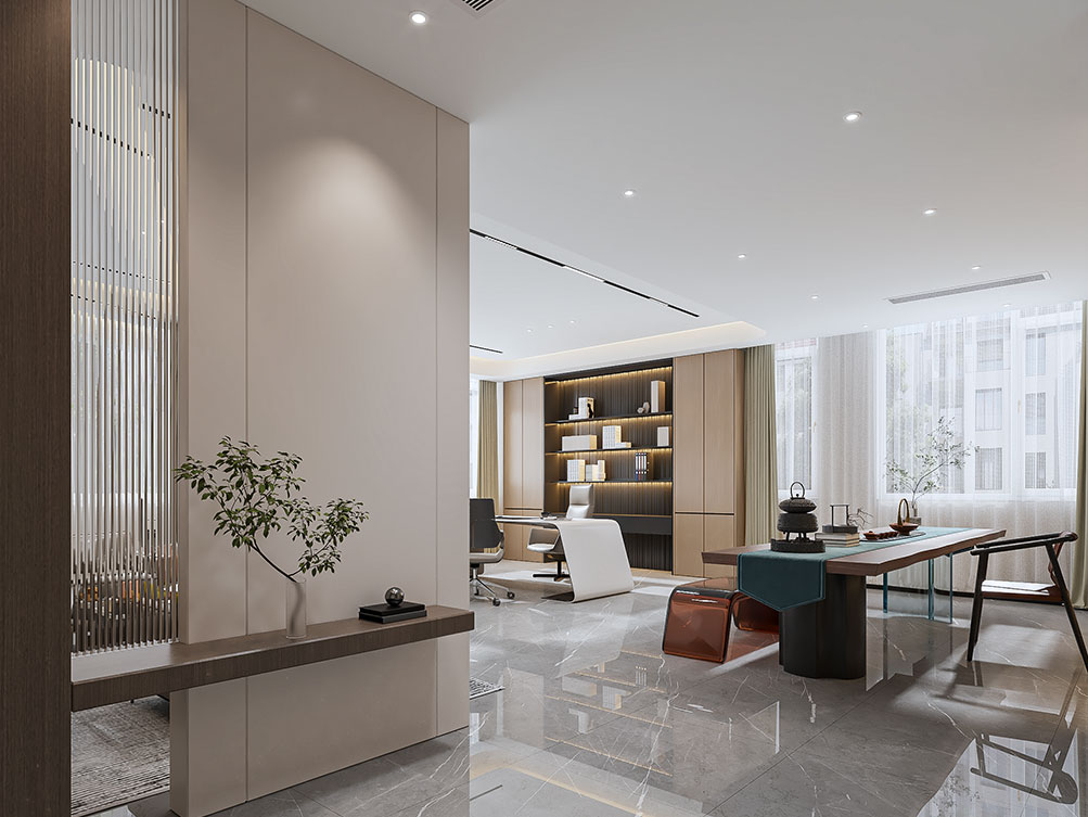 博思达办公区装修效果以 “高效协作 + 现代简约” 为核心,主色调选用浅灰、原木色与白色,营造清爽通透且兼具活力的办公氛围。空间布局上,采用开放工位与独立会议室结合的设计,开放区用低矮隔断划分区域,方便员工即时沟通,每张工位配备多功能收纳柜与可调节台灯;独立会议室按需求分小型洽谈室与大型会议空间,均配备高清投影、白板与隔音棉,满足不同协作场景;同时融入实用细节,茶水间设长条操作台与储物柜,墙面点缀简约装饰画与绿植,休闲角摆放舒适沙发与小茶几,供员工短暂放松;整体空间无冗余设计,既保证办公效率,又通过原木元素与软装搭配传递温馨感,契合现代办公对功能性与舒适度的双重需求。