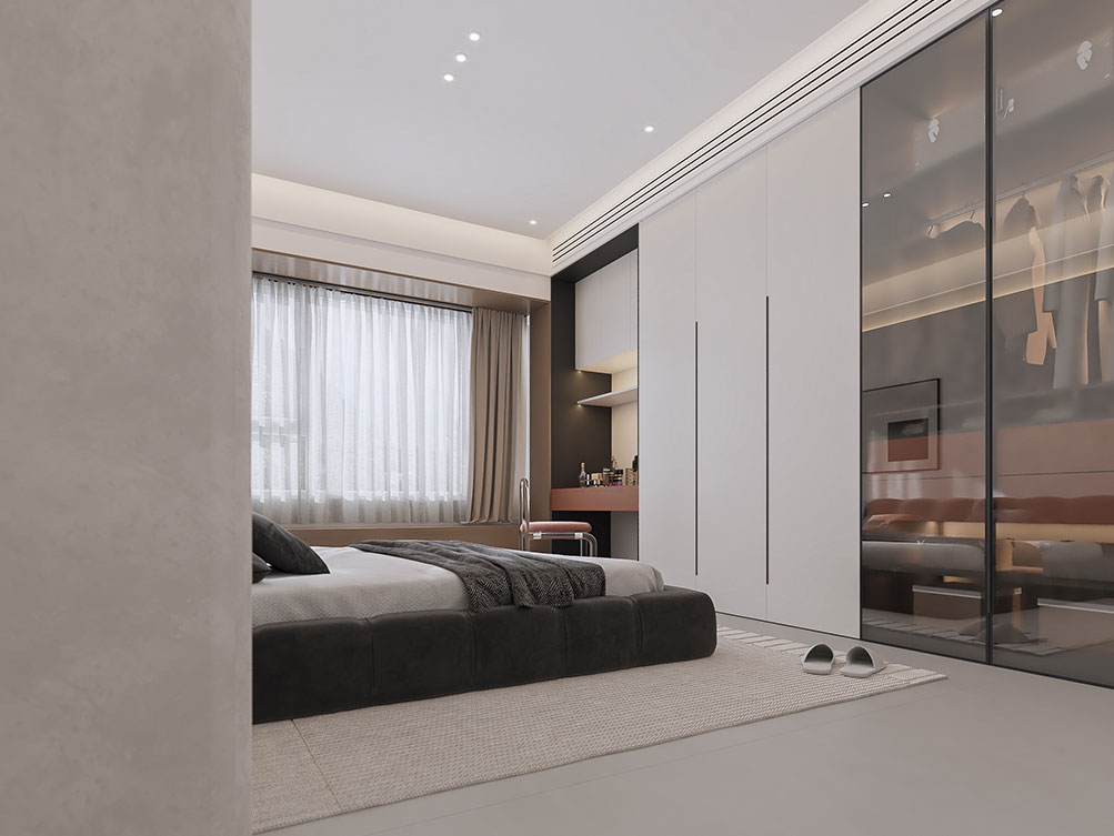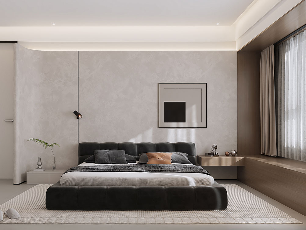 济南阿达森装饰为颖秀华府打造的现代极简轻奢风。浅米色大尺寸沙发柔化空间,搭配焦糖棕单人椅,用撞色拉出层次感;黑白纹理茶几与同质感背景墙呼应,高级又利落。深色木饰面 + 内嵌灯光的柜体,既做收纳又成视觉焦点,悬浮式地台延伸出松弛的休闲区,墙面艺术画则添了艺术张力。整体以低饱和色调铺底,通过材质对比平衡精致与舒适,刚好契合颖秀华府高端社区的品质调性,把都市大宅的松弛感稳稳拿捏。