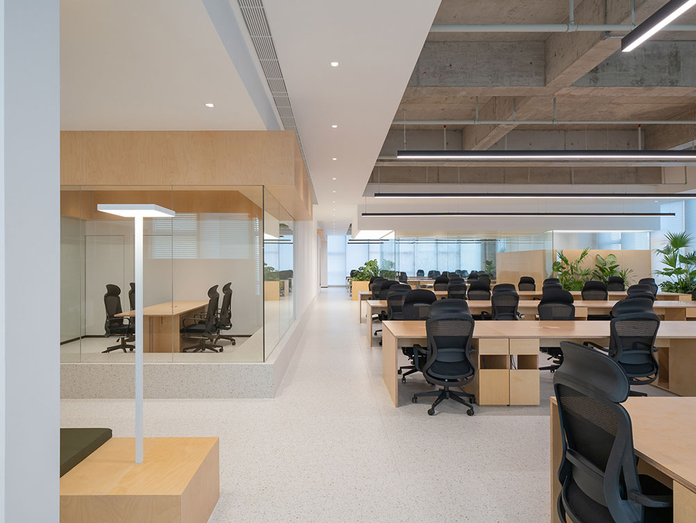 济南办公室装修中傲思拓办公室以自然共生为核,工业风清水混凝土顶搭配温润桦木,玻璃隔断保障通透。开放区原木长桌适配协作,落地窗引自然光,绿植消解冷感,半开放休闲区兼顾多元场景,既保留空间肌理,又以自然元素营造松弛高效的办公场域。