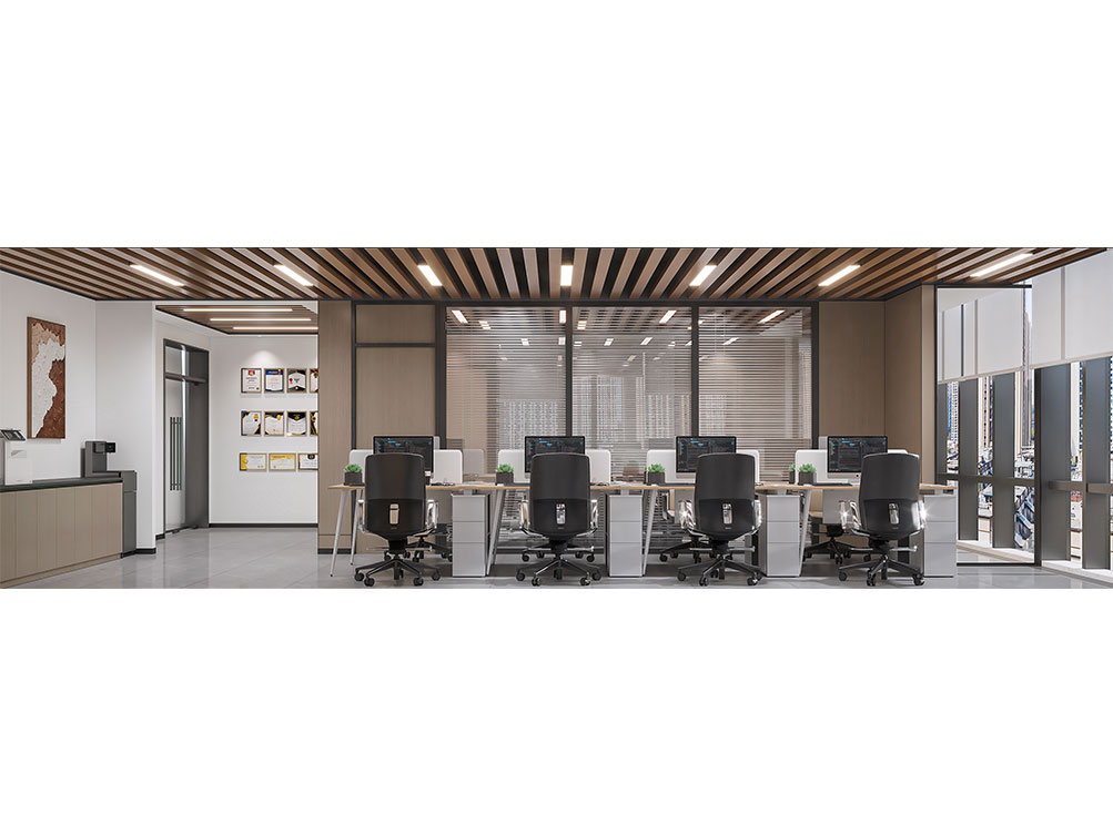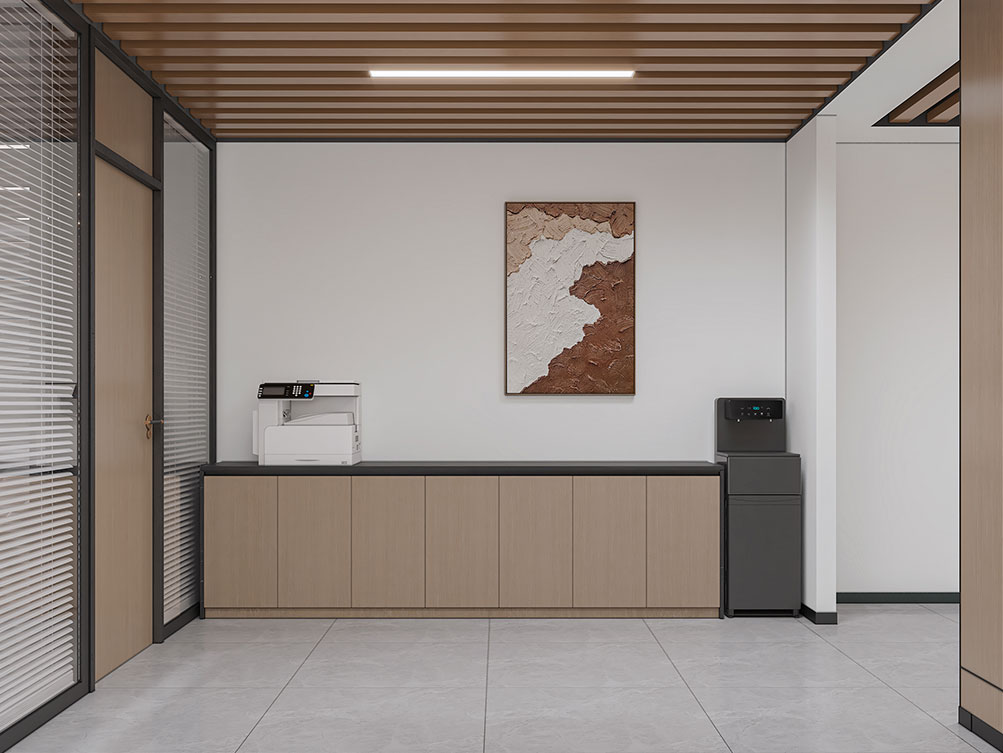 本次装修工程以高端大气来装修济南厂房办公室项目,以现代简约赋能高效办公为核心,完成了从传统生产型厂房到现代化高端办公空间的焕新升级。我们在办公室装修设计中深度结合企业的高端大气需求,打造出兼具专业质感与人文温度的办公场景。总经理办公室采用木饰面与金属线条的精致搭配,整面落地窗引入城市景观,浅棕皮质家具与简洁动线既彰显办公空间的高端沉稳,又能商务洽谈与日常办公都能在开阔视野中高效推进;会议室以竖条木质吊顶增强空间纵深感,玻璃隔断在保障隔音效果的同时保留视觉通透;开放办公区则打破传统厂房的封闭感,通过模块化工位布局与充足的自然采光,激发团队协作活力。整个厂房办公室装修项目不仅实现了空间功能的优化升级,更以细节处的人文关怀,为企业注入持久的发展动能,成为济南厂房装修领域兼具实用性与美学价值的标杆案例。