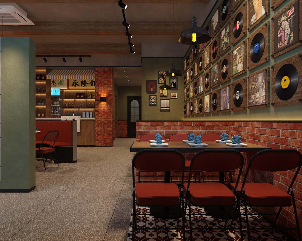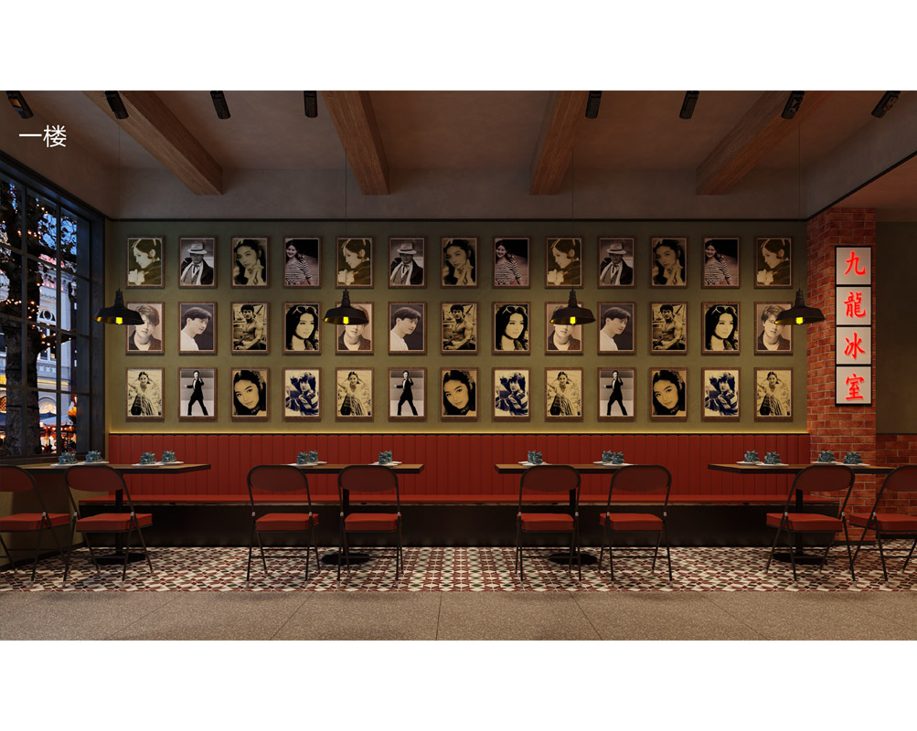 设计核心为“复古烟火,温润藏韵”,我始终认为:老港式绝非破旧杂亂的堆碍,其精髓是岁月沉淀后的温洞质感与肉敛风华一一黑凑的布局里藏着肉敛秩序,市#的烟火中浸調着时光沉淀的雅致与贵气。艺术的表达在于提炼,而非照搬,设计中拒绝刻意做旧与元素堆砌,以简洁利落的线条、经典港式色调,复刻《花样年华》的经典美学,让大排档的随性烟火,与影片传递的温柔雅致相融共生,还原老香港独有的气质
